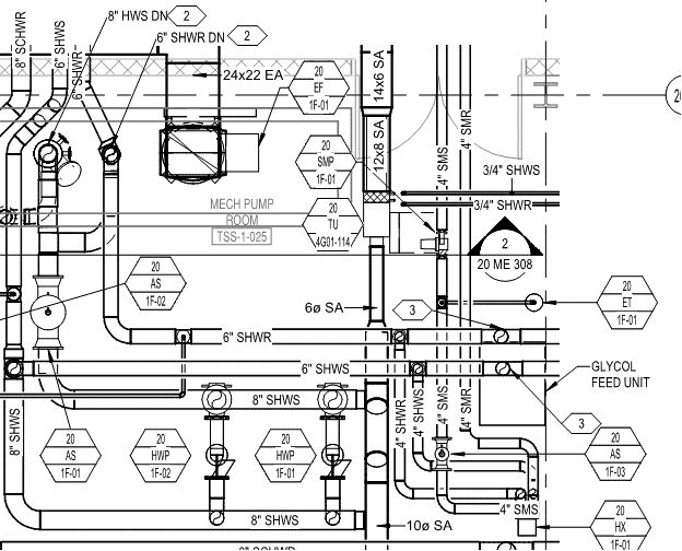 The drawing used in this question comes from a real project where SMS and SMR were not defined on a legend sheet. You have to infer that "snowmelt supply" and "snowmelt return" will be abbreviated somehow, so look for anything that could represent those two systems. SMS and SMR are in the upper right corner of the drawing image, both showing 4" as their size.